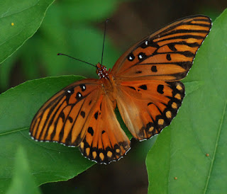 Humans, bees, and wasps aren't the only animals that love passion vines. As almost anyone who has planted one knows, gulf fritillaries (Agraulis vanillae) use them as their larval plants and the fritillary caterpillars can quickly reduce a vine to tatters. In fact, during most growing seasons I have to remind myself to "tolerate the uglies" so that my vine(s) can send many more gorgeously glowing, orange, floating "flowers" off into the breezes. Luckily, no matter how thoroughly the passion vines are eaten, they always seem to survive and thrive the following year.